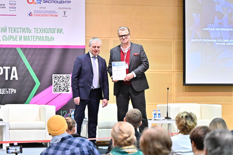 Также Фатеев вручил президенту СОЮЗЛЕГПРОМа Андрею Разбродину диплом от лица «Экспоцентра» за многолетнее плодотворное сотрудничество и в связи с проведением юбилейной 15-й Международной выставки «ИНТЕРТКАНЬ-2024.Весна».